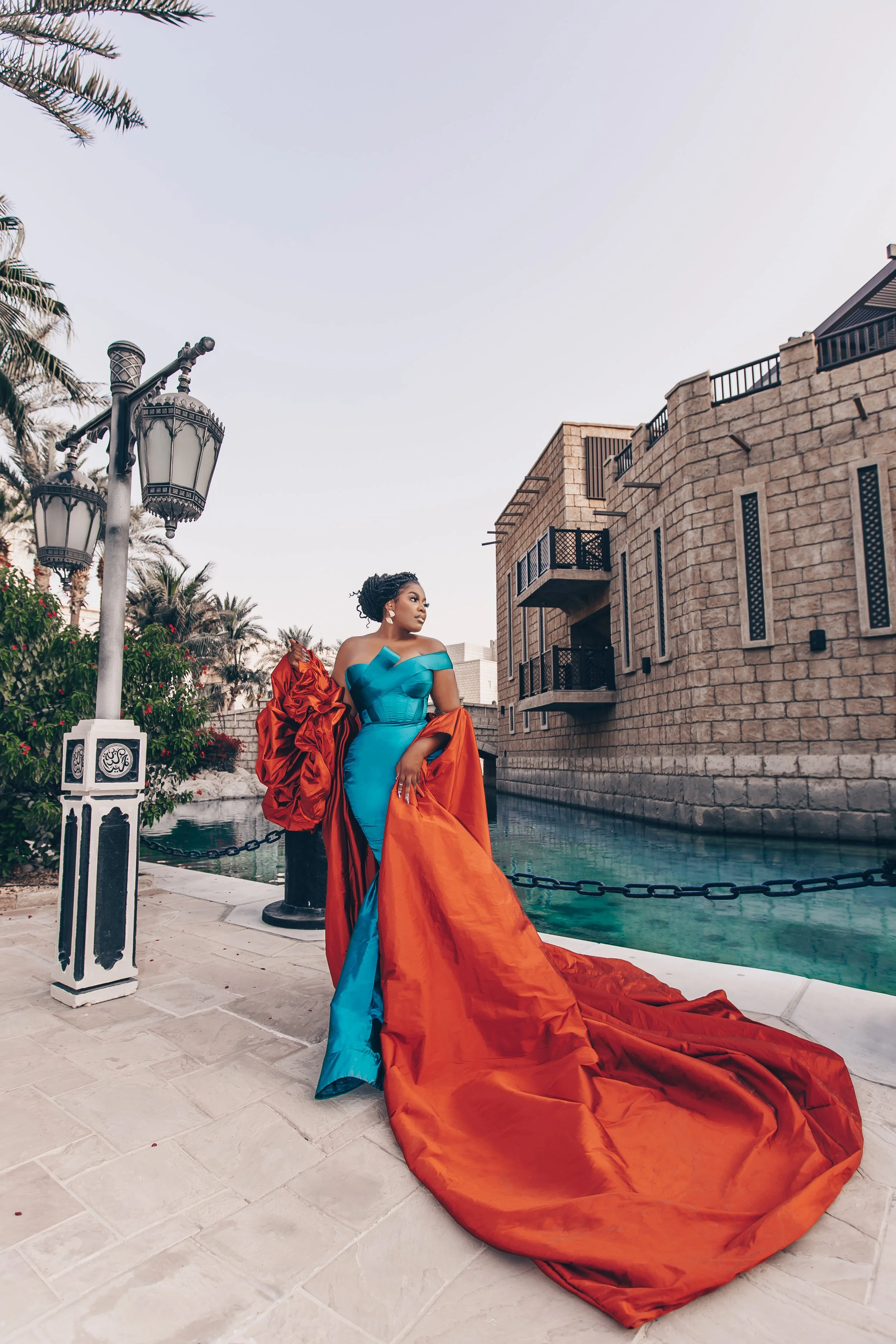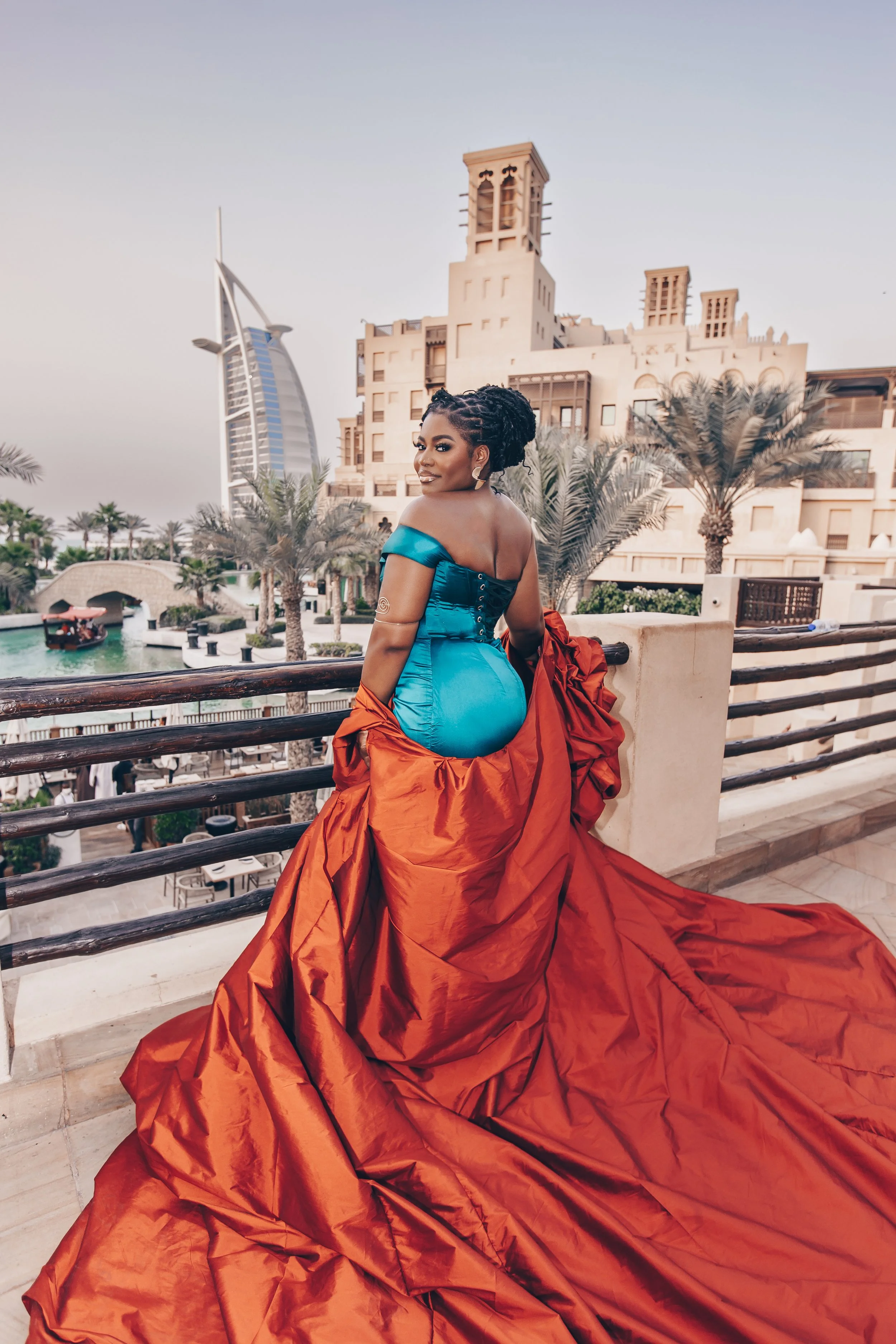 A vision of sophistication brought to life—this striking custom gown, set against Dubai’s breathtaking architecture, created a moment of pure luxury. The contrast of bold hues against timeless surroundings embodied grace, power, and opulence, making this birthday shoot a true work of art.